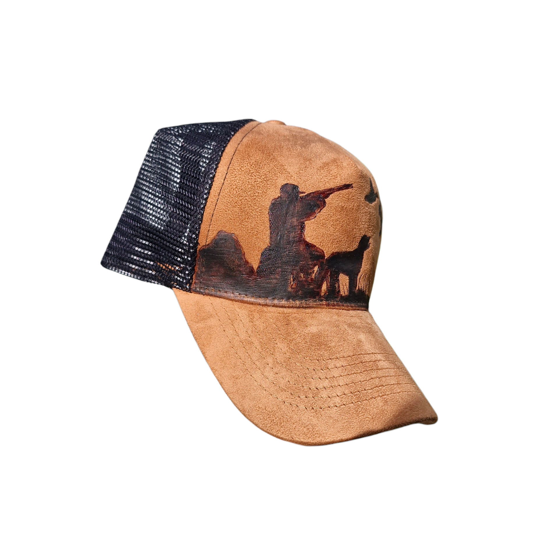 Adjustable suede cap with custom duck shooting design.