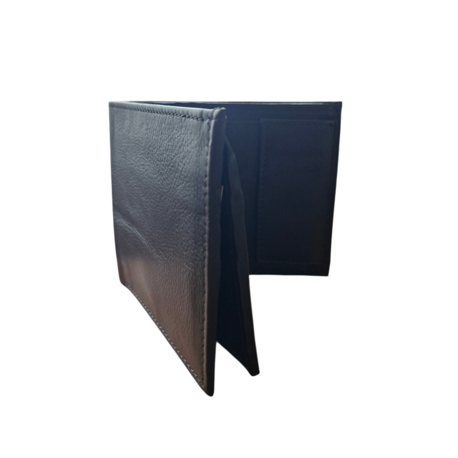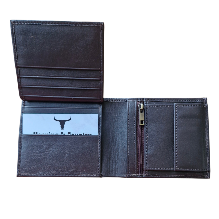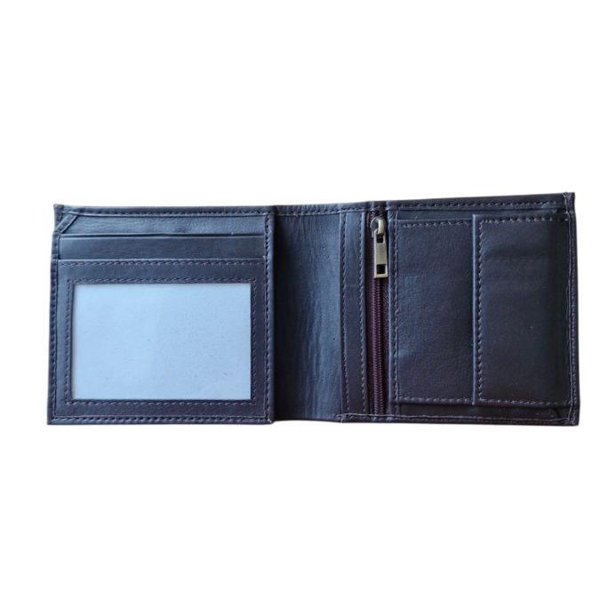 Mens wallet made from leather featuring a clear ID card window, two note slots, a zipped coin pocket card holder slots.