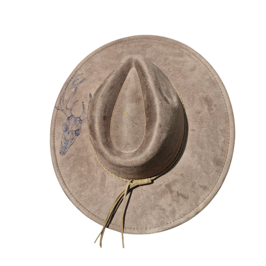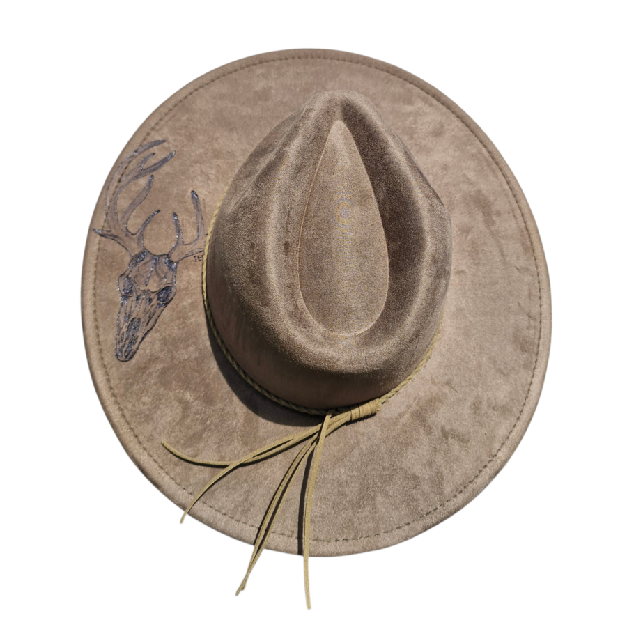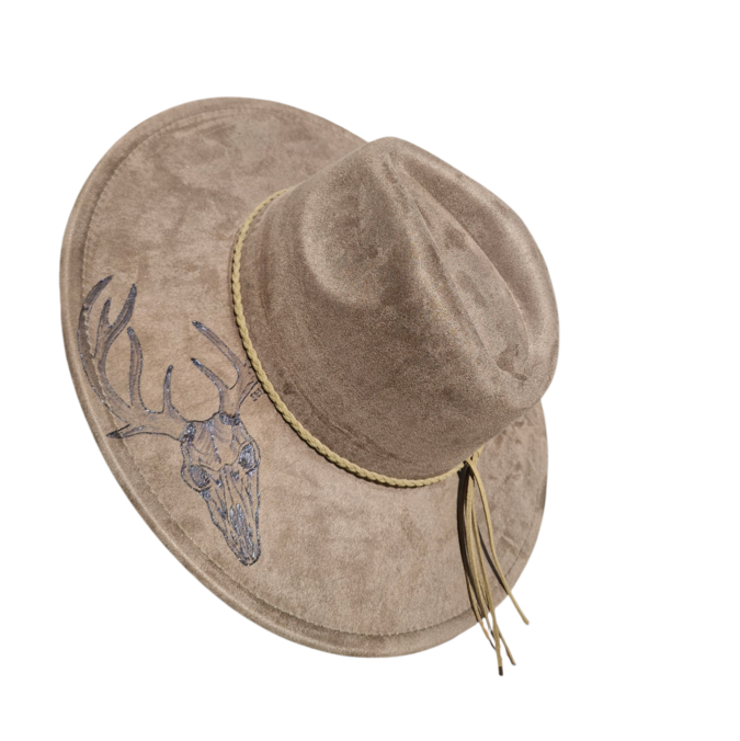One of a kind wide brim hat with stag skull design.